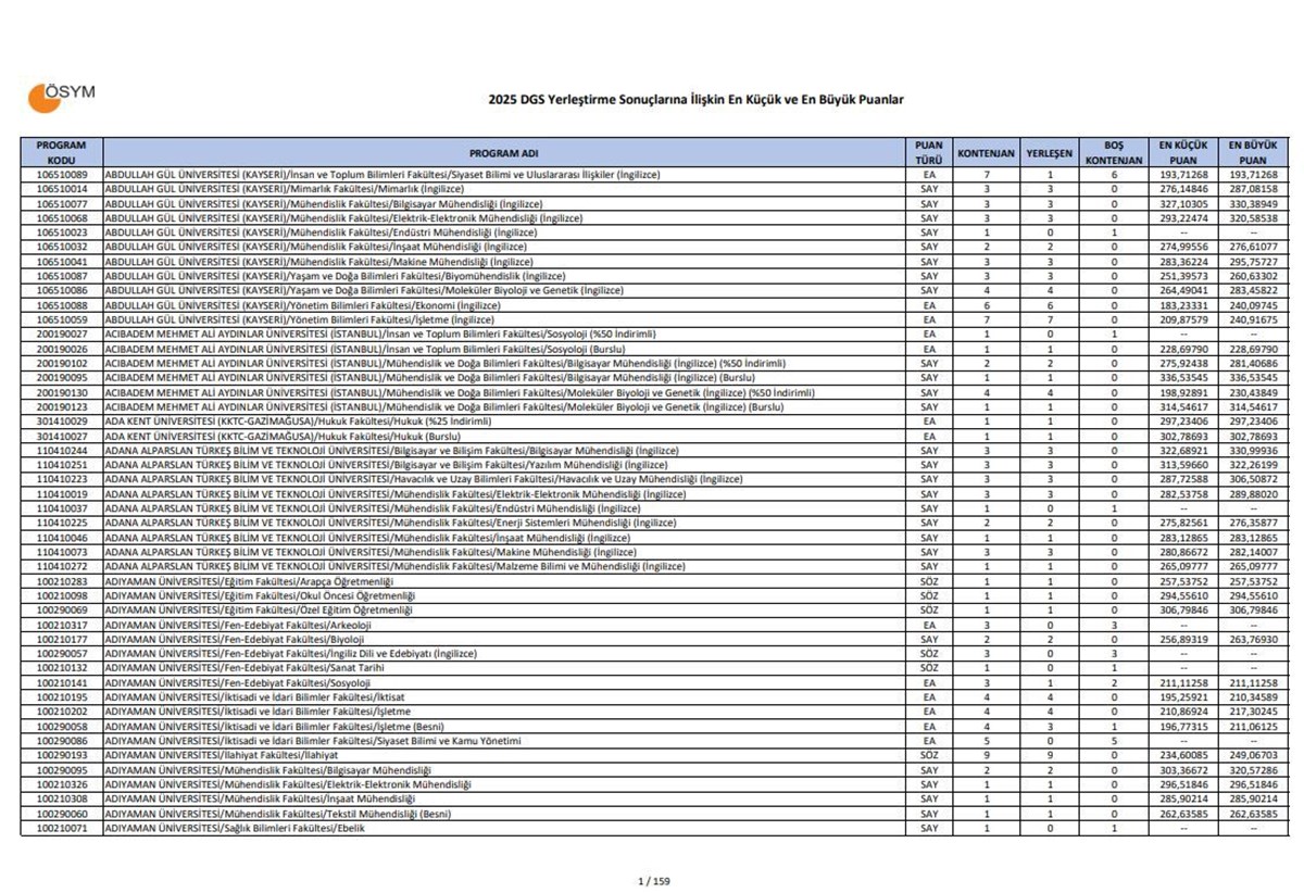 ÖSYM tarafından DGS yerleştirme işlemlerine ilişkin sayısal veriler paylaşıldı. Yerleştirme yapılan en düşük (taban) ve en yüksek (tavan) puanlar belli oldu. Tercihleri sonucunda yerleşemeyen adaylar ise ek tercihleri beklemeye başladı. Kayıt dönemi tamamlandıktan sonra boş kalan kontenjanlar, YÖK tarafından ÖSYM’ye bildirilecek ve kılavuz hazırlanacak. Adaylar kılavuz doğrultusunda ek tercihlerini gerçekleştirecek. Adaylar ise yerleşemedikleri üniversitelerin son alım yaptığı puanları gündemine aldı. Peki DGS ek tercihler ne zaman başlayacak? İşte, ÖSYM’den yapılan açıklamanın detayları…2025 DGS tavan ve taban puanları, yerleştirme sonuçlarıyla birlikte açıklandı. Adaylar, aşağıdaki bağlantı üzerinden DGS taban puanlarına ulaşabilirler.