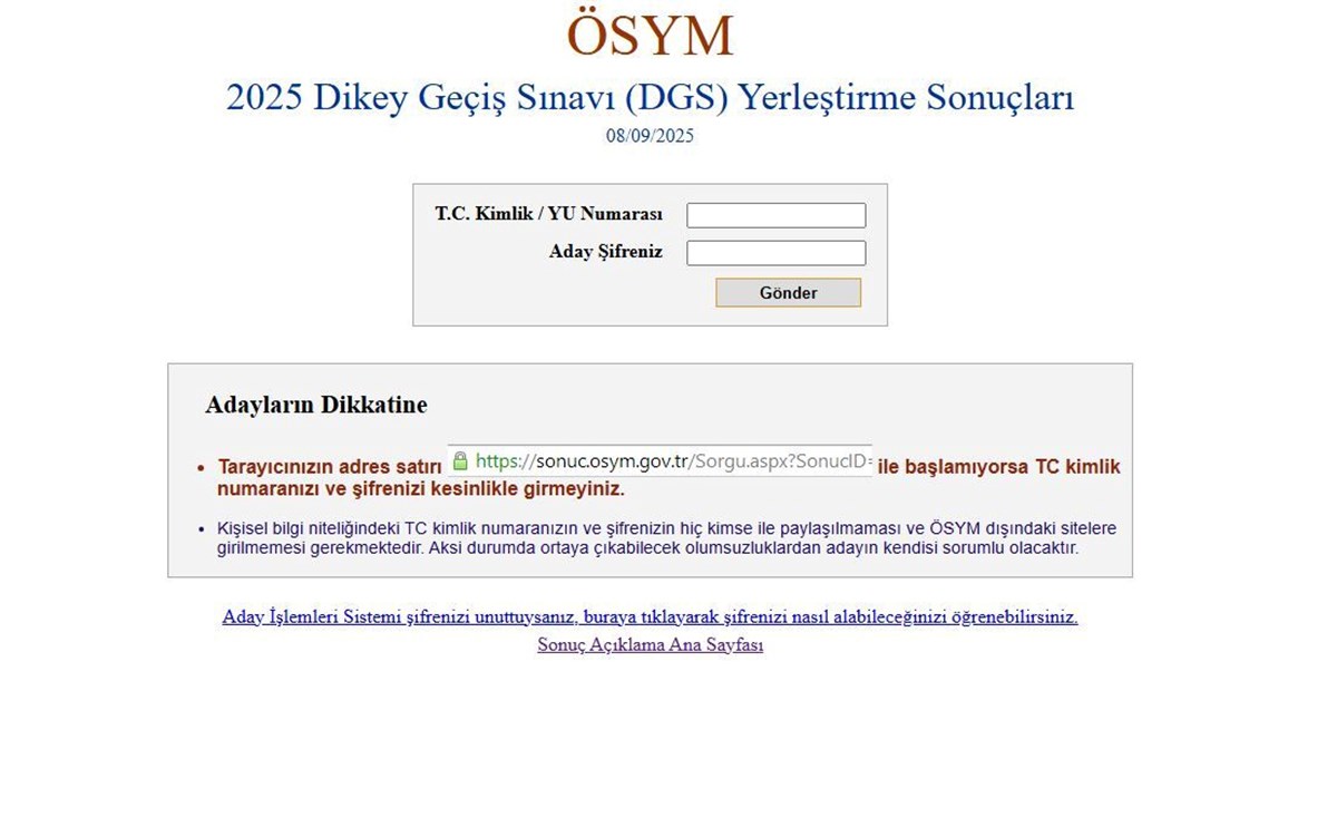 DGS yerleştirme sonuçları 2025 son dakika açıklandı. Adaylar T.C. kimlik numarası ve aday şifresiyle birlikte sorgulama işlemlerini sonuc.osym.gov.tr adresinden öğrenebilecek. Sonuçlar adaylara basılı veya mail yoluyla bildirilmeyecek. İnternet üzerinden duyurulan sonuçlar tebliğ hükmünde olacak. DGS tercih sonuçları ekranında adaylar geçiş yaptıkları üniversiteleri ve kayıt işlemlerine ilişkin detayları görüntüleyebilecek. Peki 2025 DGS tercih sonuçları nasıl sorgulanır? İşte, DGS tercih sonucu sorgulama ekranı