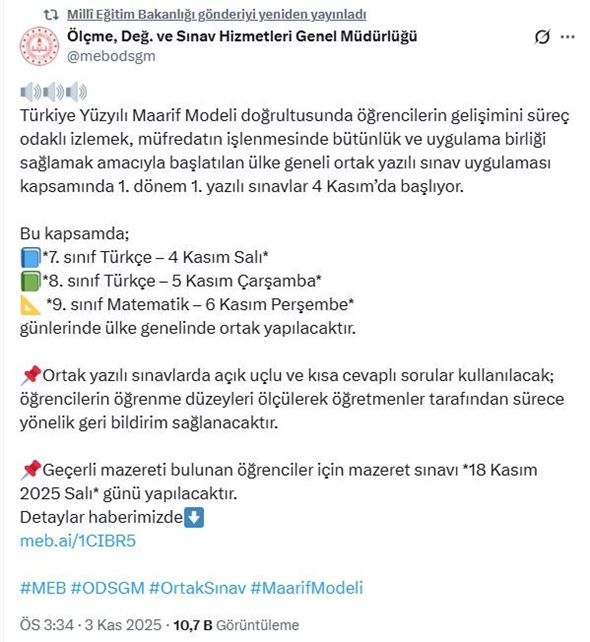 Türkiye Yüzyılı Maarif Modeli doğrultusunda öğrencilerin gelişimini süreç odaklı takip etmek, müfredatın işlenmesinde okullar arasında bütünlük sağlamak ve uygulama birliği oluşturmak amacıyla başlatılan “ülke geneli ortak yazılı sınav” uygulaması kapsamında 1. dönem 1. yazılı sınavlar, 4 Kasım 2025 tarihinde başlıyor.Bu kapsamda 2025-2026 eğitim öğretim yılı 1. dönem 1. yazılı sınavları;·7. sınıf Türkçe dersi için 4 Kasım 2025 Salı,·8. sınıf Türkçe dersi için 5 Kasım 2025 Çarşamba,·9. sınıf matematik dersi için 6 Kasım 2025 Perşembe günü ülke genelinde ortak yapılacaktır.Ülke geneli ortak yazılı sınavların soruları Bakanlığımız tarafından hazırlanmış olup 3 farklı sınıf düzeyinde yaklaşık 3 milyon 750 bin öğrenciye ait ortak yazılı sınav kâğıdı, 81 ilimizde yer alan ölçme değerlendirme merkezi müdürlükleri tarafından basılmıştır. Sınav evrakı, il/ilçe millî eğitim müdürlükleri tarafından sınav günü kapalı sınav güvenlik poşetleri içerisinde okullara ulaştırılacaktır.Ortak yazılı sınavlarda açık uçlu veya açık ve kısa cevaplı sorular kullanılacaktır. Öğrencinin konuyu anlama düzeyini, öğrenciye nasıl geri bildirim verileceğini ve öğrenme sürecinin nasıl şekilleneceğini belirlemesi açısından önem taşıyan açık uçlu soru kullanımı uygulamasıyla öğretmenler, sınıf ortamında öğrencilerin gelişim düzeyini takip ederken ülke genelindeki çalışmalarla da öğrencilerin ülke düzeyindeki gelişimleri tespit edilmektedir.Ortak yazılı sınavların değerlendirilmesi okul müdürlüklerince alınan karar doğrultusunda ilgili dersin öğretmenleri, eğitim kurumu sınıf/alan zümreleri ya da komşu okul eğitim kurumu sınıf/alan zümre öğretmenleri tarafından yapılacaktır. Öğrenci cevaplarının puanlanmasından sonra cevap kâğıtları öğrencilere gösterilecek olup cevap kâğıdında öğrencinin varsa eksik ya da yanlış öğrenmelerine yönelik öğretmen tarafından notlar alınarak öğrenciye geri bildirim verilecektir.Ortak yazılı sınavlara geçerli özürleri nedeniyle katılamayan öğrenciler, 18 Kasım 2025 Salı günü yapılacak mazeret sınavına alınacaktır. Geçerli özürleri bulunan öğrencilerin sınava katılmama gerekçesi ortak yazılı sınav uygulama tarihinden itibaren en geç 5 (beş) iş günü içerisinde öğrenci velisi tarafından okul müdürlüğüne yazılı olarak bildirilecektir. Bu öğrencilerin mazeret sınavına katılımıyla ilgili süreçler, okul idareleri tarafından takip edilecektir.
